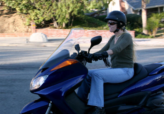 Robin wanted a little scooter to zoom around Thousand Oaks. She did all the leg work and found a GREAT deal on this 2005 Yamaha Majesty. She is still operating on a learners permit but is going to take a motorcycle safety class here very soon and will be licensed to ride. I doubt that she'll be moving up to a bigger bike though, she says this one is too heavy.