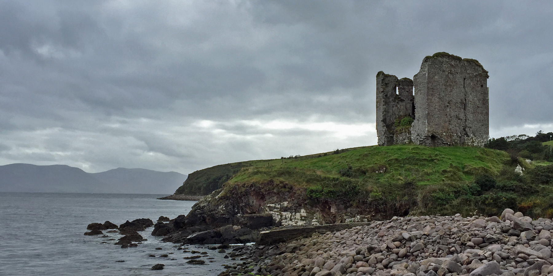 This is Minard Castle. One of the few survivors of Cromwellian Conquest of Ireland. Cromwell set off explosive charges at three of its four corners and the castle did not fall.