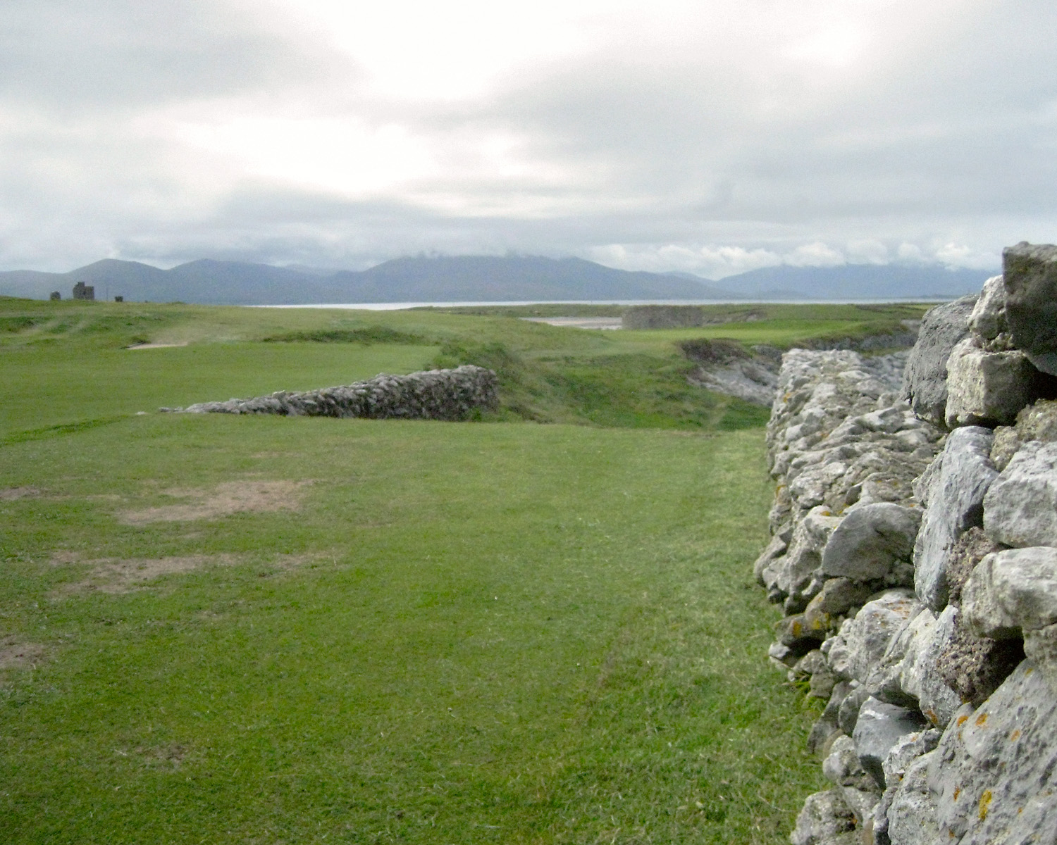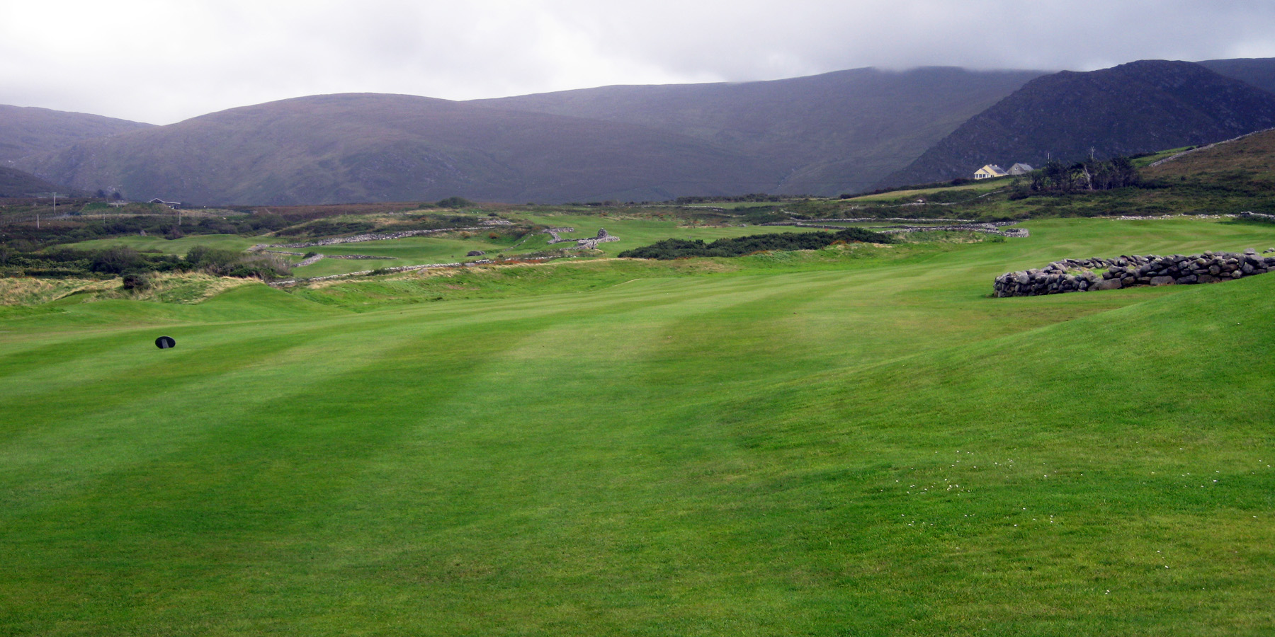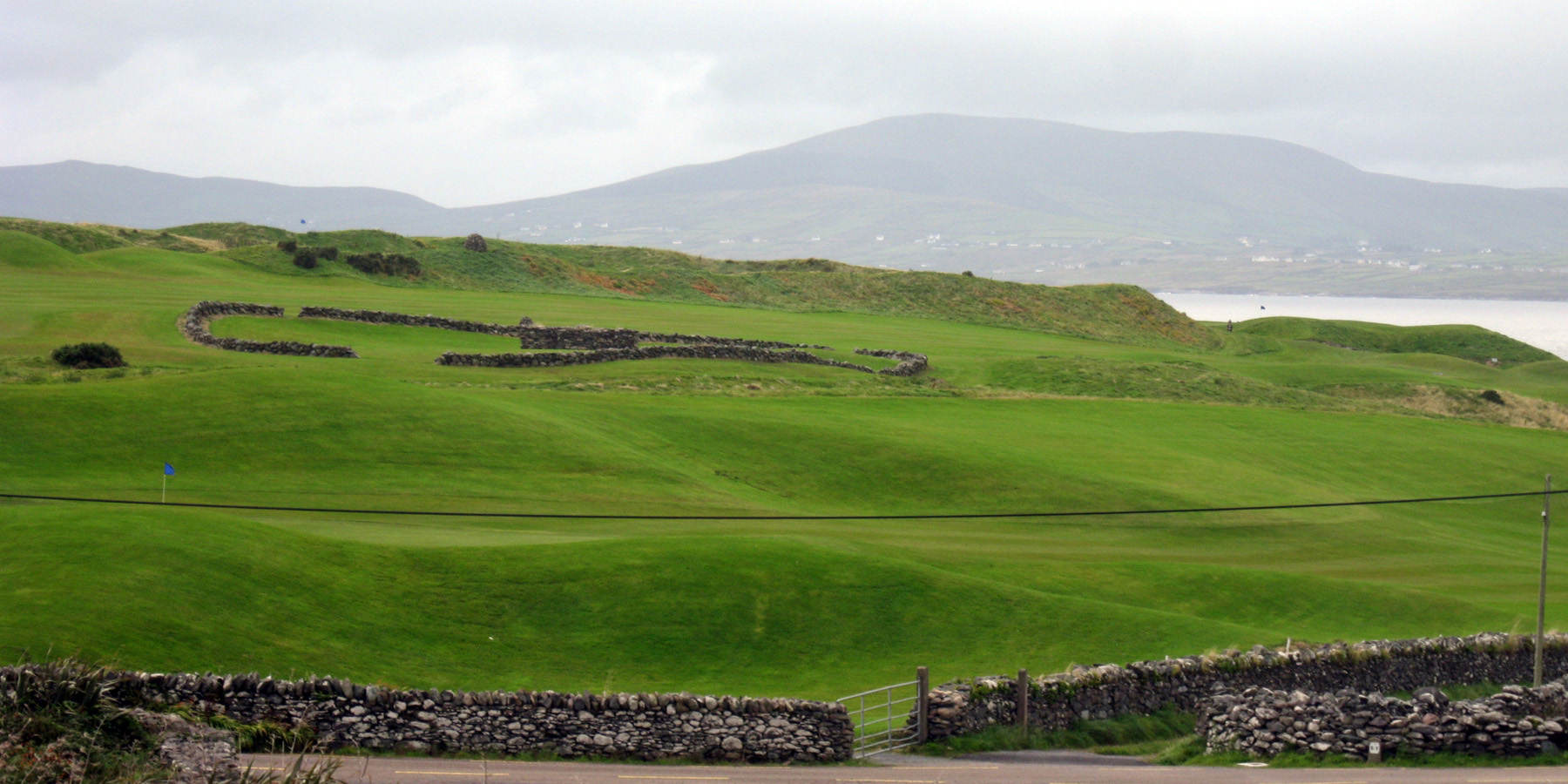 The first hole at Skelig Bay Golf Club. The course is framed by these low rock walls that you see throughout Ireland. Many of the walls were built during the Potato Famine 1845-1848. Land owners would pay for the workers labor with small amounts of food. The Irish are a proud people and would not take the food without working for it. Megalithic stonework hundreds of years old, including these stone circles, the remnants of a ring fort or fairy fort. are all over the golf course.